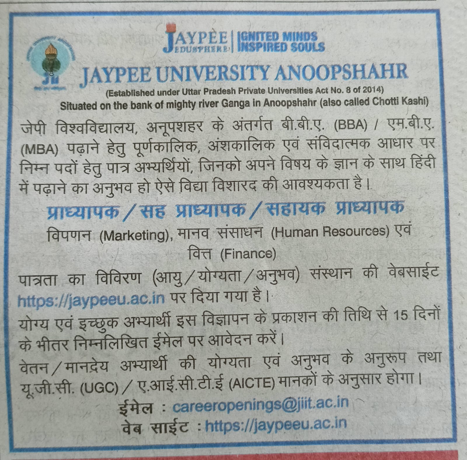 | Management | Faculty | hrcell@mail.jaypeeu.ac.in | October 31, 2025 | Business Analytics and General Management/