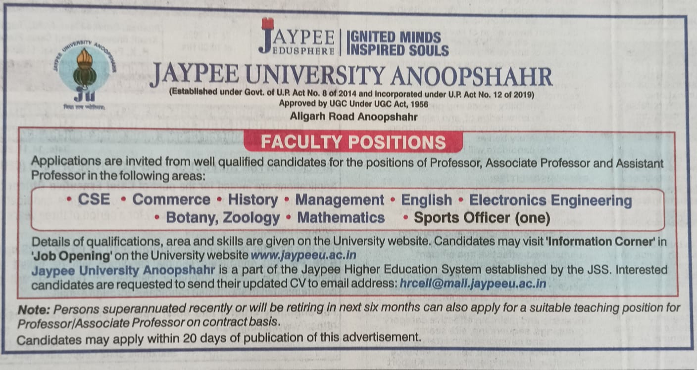 | All faculty of studies | Professor, Associate Professor, Assistant Professor | hrcell@mail.jaypeeu.ac.in | December 8, 2025 | AI/ML/Data